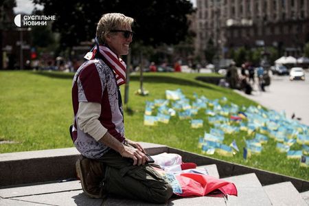 Reuters video footage showed him in Kyiv in May 2022 at protests calling for international support for Ukrainian fighters. A photograph taken in Kyiv at the time shows him holding a Ukrainian flag and wearing a scarf with the U.S. stars and stripes on it.