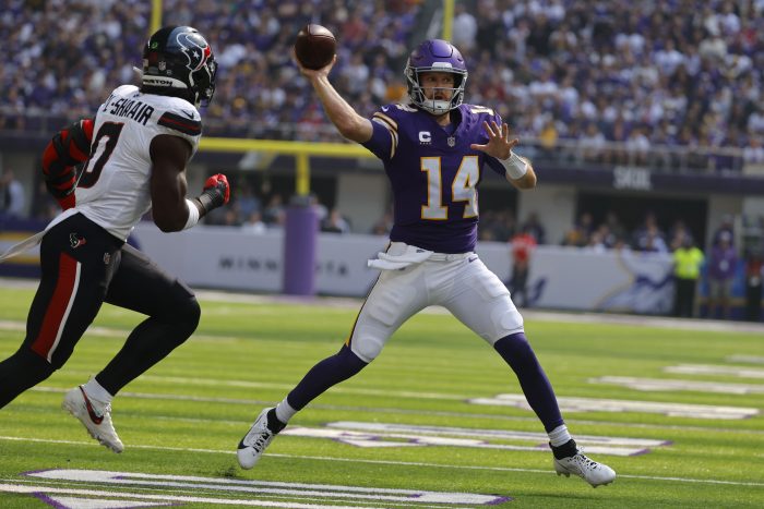Darnold didn’t find much to work with on deep routes against the Texans, with only one passing play that exceeded 25 yards. Jefferson did his usual damage with six catches for 81 yards and a touchdown, but the absence of Jordan Addison and T.J. Hockenson makes a difference over time in the frequency of openings.