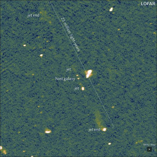The latest combined jets from a faraway supermassive black hole are around 23 million light-years long. That’s about 7 million light-years longer than the previous recordholder. A light-year is 5.8 trillion miles.