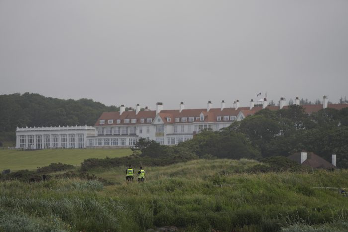 TURNBERRY, Scotland (AP) — It may not be typical golf attire, but one of the most ubiquitous outfits seen on U.S. President Donald Trump ‘s golf course Friday ahead of his visit was the reflective yellow vest worn by Scottish police.