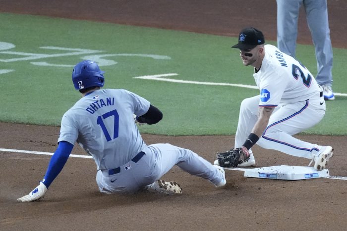First base was open when Ohtani came up to bat in the seventh, but Marlins manager Skip Schumaker decided against intentionally walking him with the Marlins trailing 11-3.
