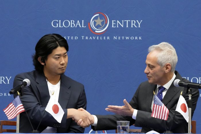 “In about eight weeks I can cheer for one of those many baseball teams that play in the States,” Emanuel added. “Right now sitting here in front of you I’m happy he (Sasaki) is going to come to the United States. I have a personal favorite, but I can’t go that way as ambassador. You can read the bubble above my head, what it’s saying — but I’m not saying it.”