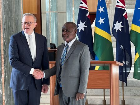 CANBERRA (Reuters) -Solomon Islands Prime Minister Jeremiah Manele met Australian counterpart Anthony Albanese in Canberra on Wednesday to discuss security and development ties, as the United States and China vie for influence in the Pacific Islands region.