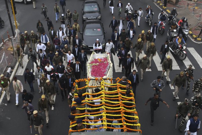Singh’s body was taken Saturday morning to the headquarters of his Congress party in New Delhi, where party leaders and activists paid tributes to him and chanted “Manmohan Singh lives forever.”