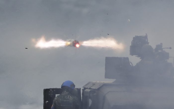 Troops fired tube-launched, optically tracked, wire-guided missiles known as TOW 2A missiles mounted on M1167 Humvees at floating targets off a beach in Pingtung County during the two days of exercises. The area on Taiwan’s southern tip faces both toward the Taiwan Strait and China, and toward the Pacific Ocean.