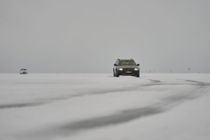 A vehicle cannot be heavier than 2.5 tons (5,500 pounds) and it has to drive either below 20 kph (12.4 mph), or between 40 and 70 kph (25 and 43 mph) — anything in between can create a vibration that damages the ice. Cars are not allowed to stop and need to maintain a safe distance from one other. Passengers cannot wear seat belts and doors must be easy to open, to allow for fast exit in case of an accident.