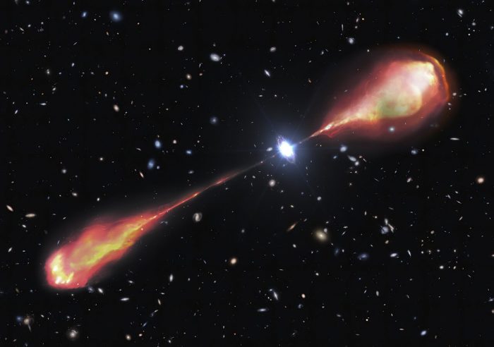Radio jets like this are not uncommon in our cosmic neighborhood. But they’ve been elusive in the distant early universe — until now — because of the obscuring cosmic microwave background left over from the Big Bang.