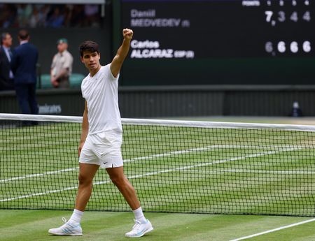 LONDON (Reuters) – Carlos Alcaraz had a case of the jitters in the first set of his Wimbledon semi-final victory over Daniil Medvedev on Friday but said he managed to calm his nerves and turn the match on its head to set up a box-office encounter with Novak Djokovic.