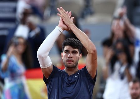 PARIS (Reuters) – Third seed Carlos Alcaraz made a winning start in his bid to claim a first French Open title when he beat American J.J. Wolf 6-1 6-2 6-1 without any issues on his troublesome arm on Sunday.