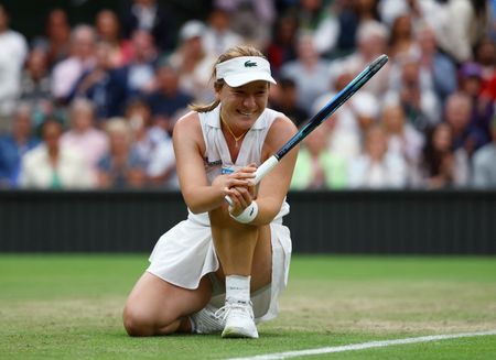 LONDON (Reuters) – The word “astonish” decorated the front of Lulu Sun’s white shirt and it proved an entirely appropriate flourish as the 123rd-ranked qualifier dished out a juddering Wimbledon reality check to Britain’s Emma Raducanu on Sunday.