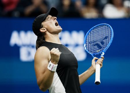 NEW YORK (Reuters) -Iga Swiatek’s first evening under the bright lights of Arthur Ashe Stadium nearly turned into a nightmare before the world number two summoned her championship resolve to beat Anna Kalinskaya 7-6(2) 6-4 at the U.S. Open on Saturday.