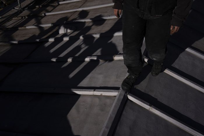 Using welding techniques from the 1800s, they measure each new sheet of zinc so it fits the shape of the roof just right. Then they mount the often slippery roofs to affix the sheets to their new home.