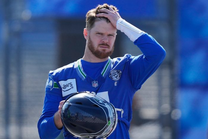 PHOTO- Seattle Seahawks quarterback Sam Darnold (14) arrives during an NFL Super Bowl football practice on Friday, Feb. 6, 2026, in San Jose, Calif., ahead of Super Bowl 60 between the New England Patriots and the Seattle Seahawks. (AP Photo/Brynn Anderson)