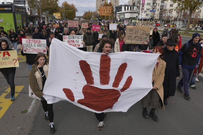 NOVI SAD, Serbia (AP) — Thousands joined a protest march on Sunday in the northern Serbian city of Novi Sad that marked one month since a concrete canopy ouside of the city’s railway station collapsed, killing 15 people and injuring two. Protesters held a huge banner with a red handprint at the front of the […]