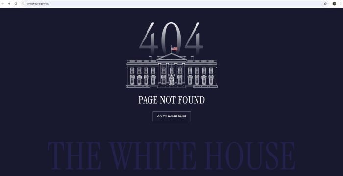 The site — currently https://www.whitehouse.gov/es/ — now gives users an “Error 404” message. It also included a “Go Home” button that directed viewers to a page featuring a video montage of Trump in his first term and on the campaign trail. The button was later updated to read “Go To Home Page”.