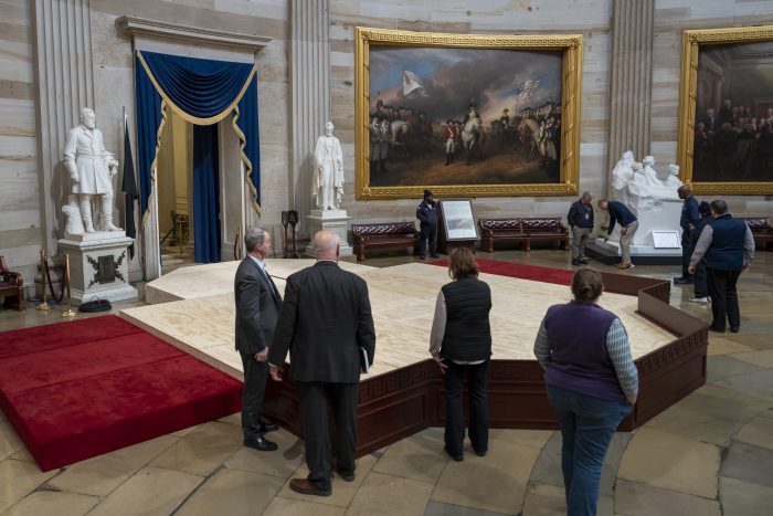 Trump then heads to the Capitol, where his ceremony has been moved indoors as temperatures are set to plummet and make it the coldest Inauguration Day in 40 years. It’s not quite clear how the ceremony will be adapted to the Capitol Rotunda, which holds only 600 people. More than 250,000 guests were ticketed to view the inauguration from around the Capitol grounds.