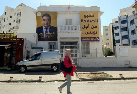 TUNIS (Reuters) – Supporters of current Tunisian President Kais Saied began celebrations in the capital on Sunday night after an exit poll broadcast on state television showed him winning, beating two rivals, one of whom is now in prison