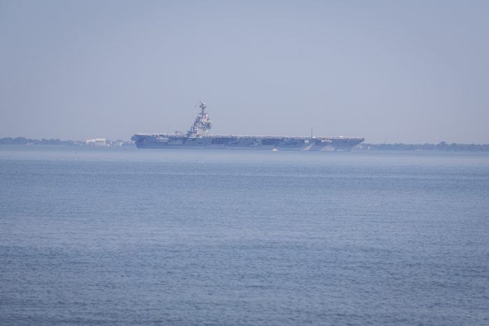 The fluid and potentially dangerous situation was on the minds of many families who cheered on the Ford as it slowly steamed away from its pier in Norfolk, with tugboats hugging the carrier’s hull and sailors lining the sprawling deck in their white dress uniforms.