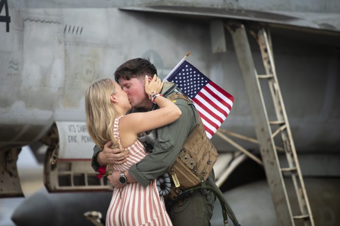 F/A-18 Super Hornets swooped over waiting families in a low formation before landing at their base in Virginia Beach. Dressed in green flight suits, the aviators embraced women in summer dresses and kids carrying American flags. Some handed red roses to their wives and daughters.