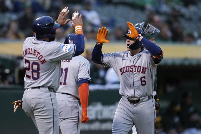 Astros: RHP José Urquidy was pulled from his rehab start with Triple-A Sugar Land because of right forearm discomfort. He has been on the injured list with inflammation in his pitching shoulder. … 1B José Abreu is scheduled to rejoin the club Monday in Seattle after playing at least two games with Triple-A Sugar Land as he works to regain his hitting rhythm.