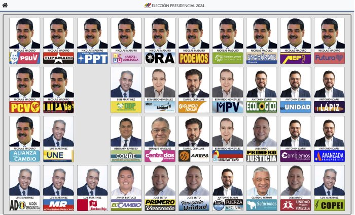 Venezuela’s electoral rules allow for candidates’ pictures to appear on the ballots — the electronic ones within Venezuela and printed for those voting abroad — as many times as the number of parties that support them. This year’s ballot has 38 pictures, each with every candidate’s name and party underneath.