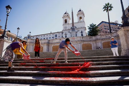 Members of the movement called “Bruciamo tutto” – or “Let’s burn everything” – poured cans of the liquid down the Spanish Steps and also made prints of their hands with it.