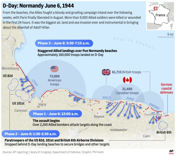 Almost 160,000 Allied troops, 73,000 from the United States, landed at Normandy on June 6, 1944, in a massive amphibious operation designed to break through heavily fortified German defenses and begin the liberation of Western Europe.